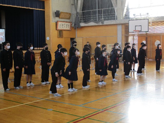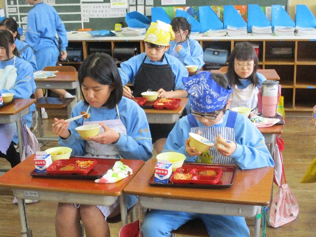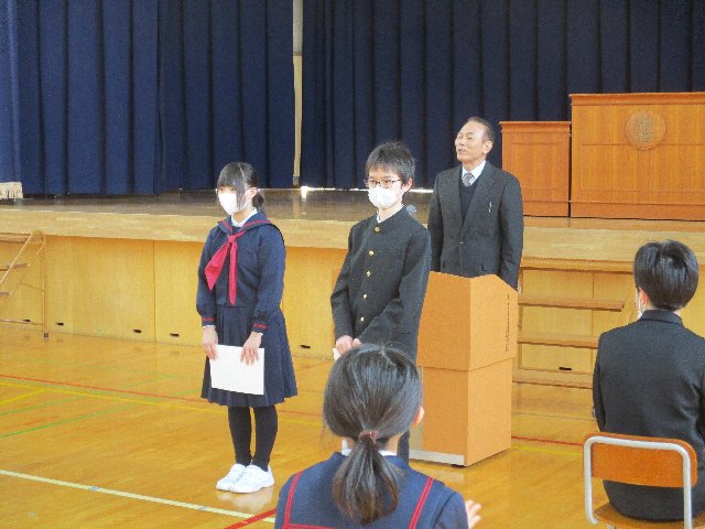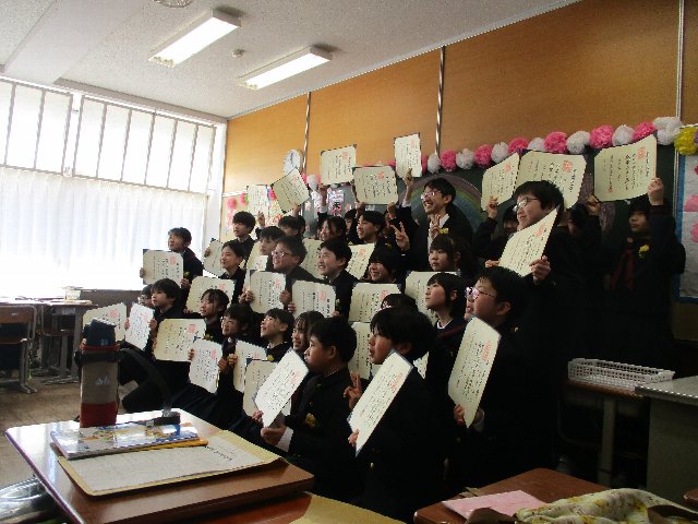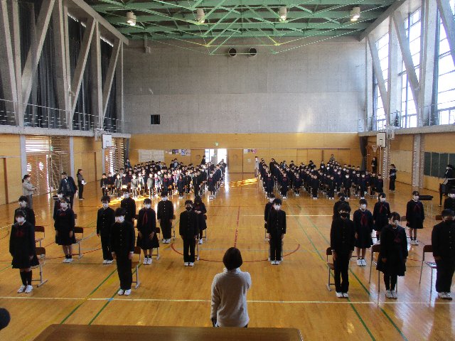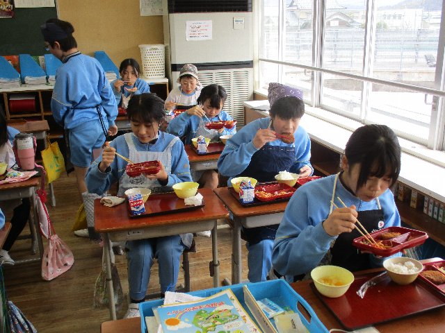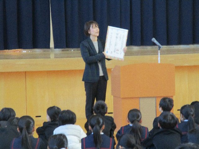 今日は、さくら賞の表彰と中学校給食体験の日でした。 さくら賞は、インフルエンザ等の出席停止を除き6年間1日も休まなかった子を市が表彰するもので、今回は6年生2人が受賞しました。 また、初めて中学校給食を食べた感想を6年生に訊ねると、「案外おいしい。」と好評でした。中学校でもたくさん食べて大きくなってください。