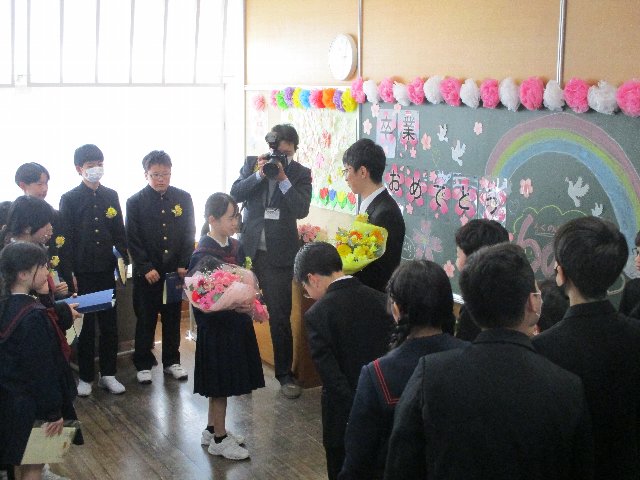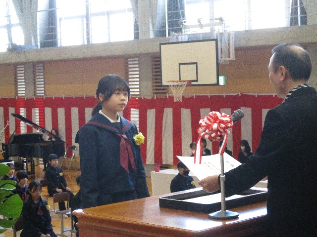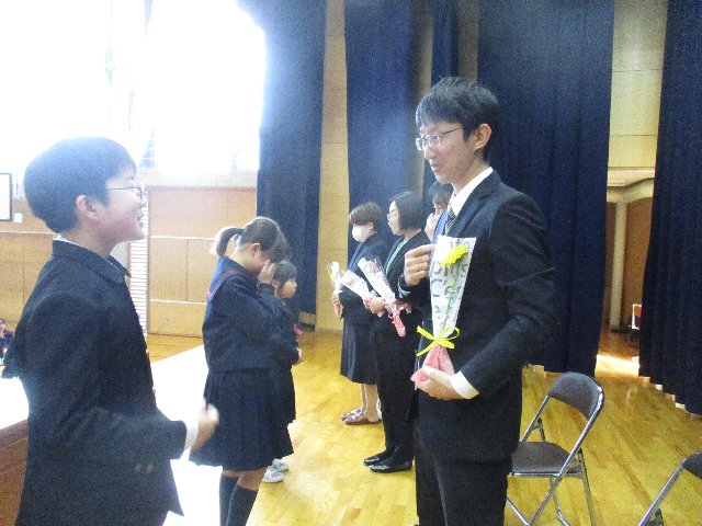今日は卒業証書授与式が行われ、33名の6年生が旅立っていきました。 式の中では、6年生が凛々しい姿を見せてくれ、在校生は素晴らしい言葉や歌声で式を盛り上げてくれました。来賓の方々からは、「とても素晴らしい卒業式でした。」というお褒めの言葉をいただきました。 式の後の学級の時間では、担任の先生からの温かい言葉や子ども達から先生への感謝のメッセージなどが送られ、とても素敵な時間となりました。卒業生の皆さん、中学校でも頑張ってください。