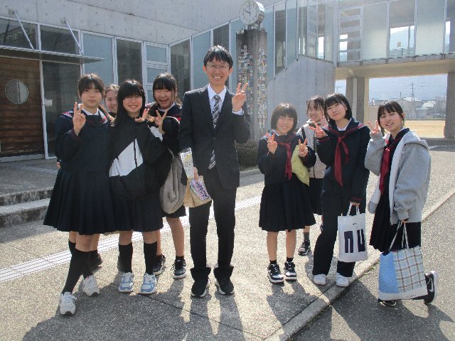 今日は、お世話になった先生方が去られる離任式が行われました。 卒業式で6年生を送り出したばかりの幸道先生も、越前市の北新庄小学校に異動されることになりました。感謝の言葉を伝えたいと、卒業生がたくさん来て、先生との最後の時間を過ごしていました。幸道先生、新天地でのご活躍を願っています。