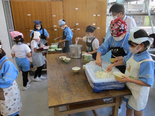 6年生が調理実習に取り組んでいました。 メニューは、「ほうれん草とベーコンとトウモロコシのソテー」でした。最初に材料を適度な大きさに切ってから炒め始めました。味付けは塩とコショウのみです。シンプルな味ですが、どの班からも食べ始めるとおいしそうな笑顔が見られました。