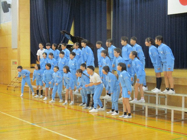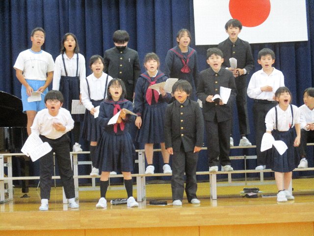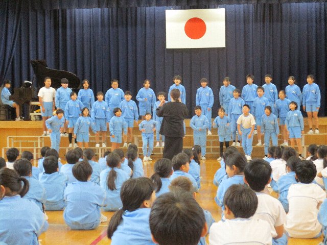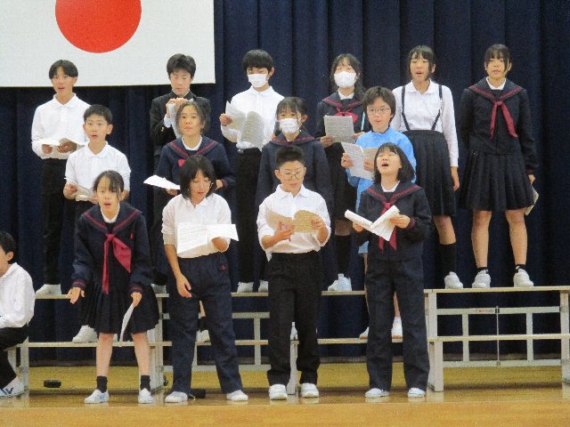 今日の業間の時間に、連合音楽会で歌う合唱を全校の前で発表しました。 宮永先生の指揮のもと、全員が気持ちよく体を動かしながら歌うことができました。6年生の素晴らしい合唱が終わると、聴いていた1~5年生から大きな拍手が送られました。最後に代表の3人が連合音楽会への決意を述べて発表が終わりました。6年生の皆さん、明後日の本番でも頑張ってください。