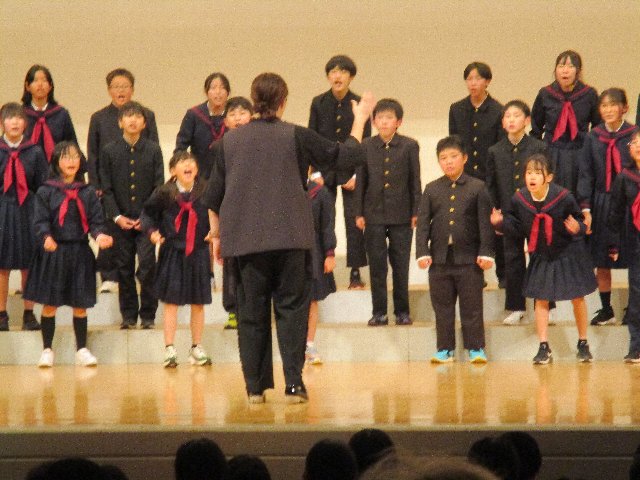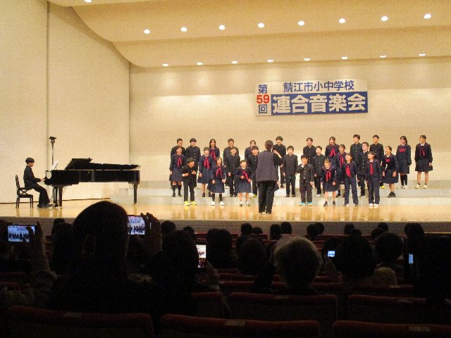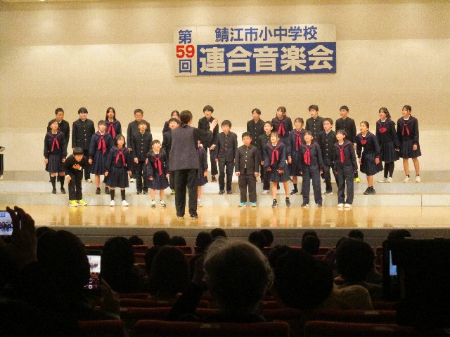鯖江市文化センターで連合音楽会が行われました。 「大人になっても きっと忘れない 夢をかなえて ドラえもん」のセリフの後に、合唱がスタートしました。初めてのステージなのできっと緊張した子もいたと思いますが、最初からリズムにのって体を動かしながら歌う姿が素晴らしかったです。また、合唱自体も抑揚のある美しい歌声で、歌い終わった後には会場から大きな拍手をもらっていました。