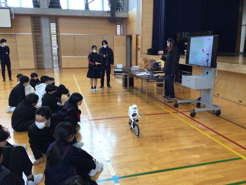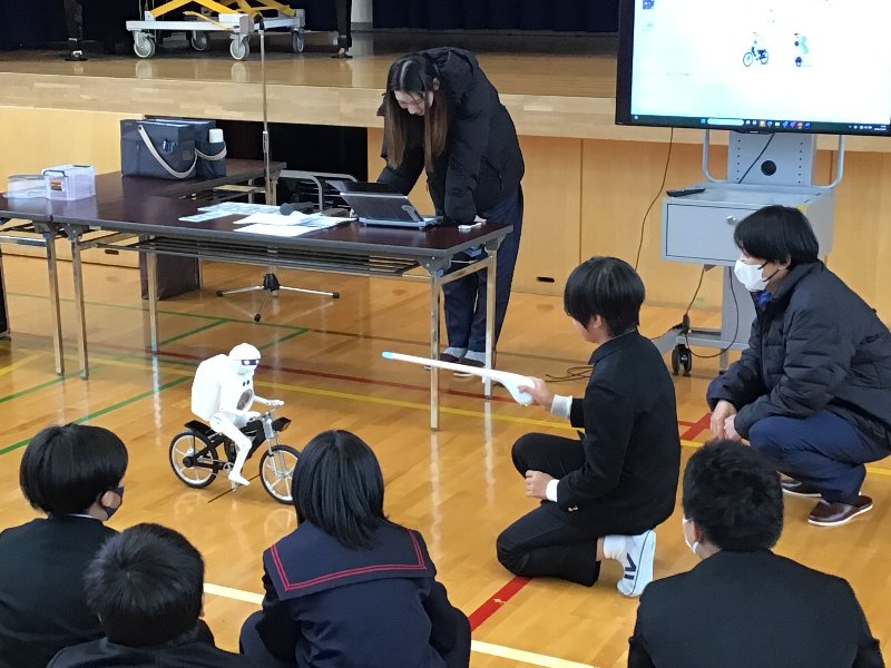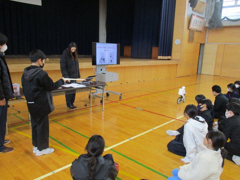 村田製作所様のご協力で、ロボット「セイサク君」の実演と、操作体験をさせていただきました。マジック・スティックの動きだけで、バランスをとりながら走行するロボットを制御できることに、子どもたちは驚いていました。 停車しても倒れることのない技術にも感心していました。 AIロボットの先駆けとして製作された歴史も学び、その技術がデジタルカメラなどにも応用されていることが分かりました。