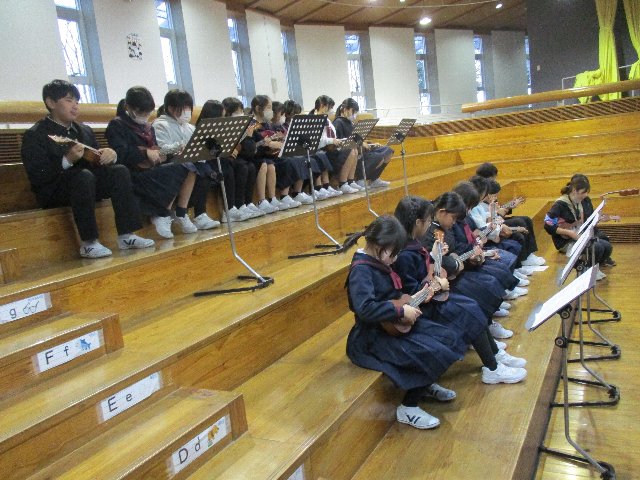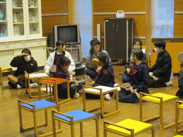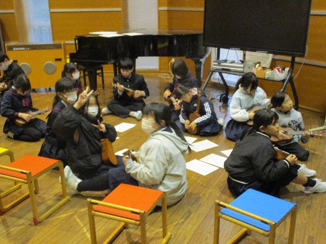 今日は本年度最後のクラブということで、ウクレレクラブが発表を行いました。 クラブの前半は音楽室で最後の練習に取り組みました。そして、玄関前のホールに移動して、いよいよ発表です。『きらきら星』と『カントリーロード』の2曲を弾きました。とても上手な演奏で、終わったときに見学に来たたくさんの児童から大きな拍手をもらっていました。