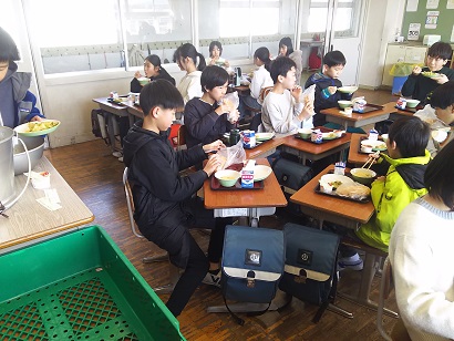 時が経つのは本当に早いもので、教室に「卒業まであと○日」のカウントダウンが貼られてから、あっという間にこの日を迎えることになりました。そして今日は、6年生にとって小学校生活“最後の給食”。 ラストを飾ったメニューは、みんな大好きな 「きな粉揚げパン」 でした! 口のまわりにきなこをつけながら頬張る姿、友達と笑い合いながら味わう姿──どの子もとても楽しそうで、給食室から届いた温かな味をしっかりと心に刻んでいるようでした。