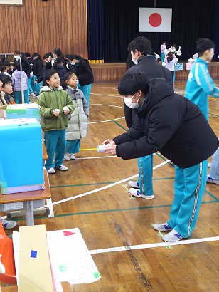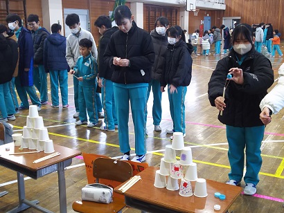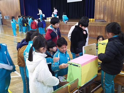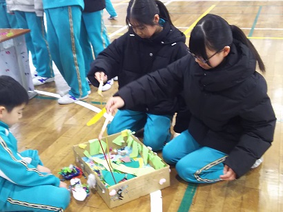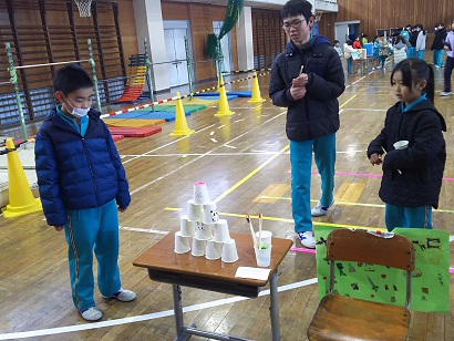 うちわで風を送って走らせる車のレースや、輪ゴムで紙コップを飛ばす射的など、工夫をこらしたブースがたくさん並びました。2年生の子どもたちは「6年生に楽しんでもらいたい!」 という思いで張り切って運営していました。6年生も笑顔いっぱいで、あっという間に時間が過ぎてしまうほど楽しんでいました!