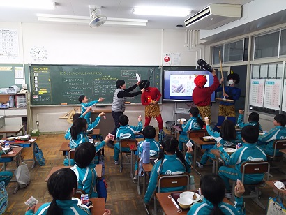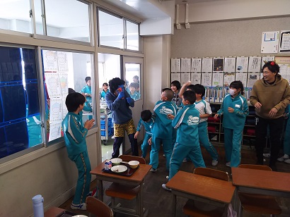 給食の時間に各クラスを回りながら、 「給食をちゃんと食べているか~?」 「授業をしっかり受けているか~?」 と、子どもたちに声をかけていく鬼たち(^^)/
