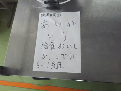 配膳後のワゴンには、調理員さんへの感謝のメッセージも添えられていました。 6年間の「おいしい!」を支えてくださった皆さんへの、子どもたちなりのありがとうです。