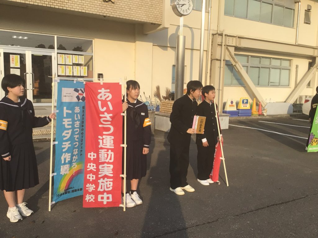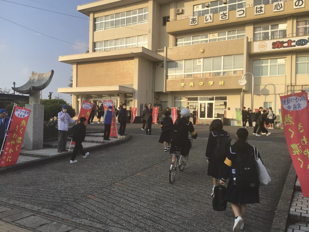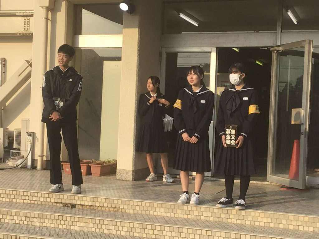11月7日(金)、青少年健全育成鯖江市民会議の皆さんと生徒会メンバーであいさつ運動を実施しました。歳末助け合いの募金も呼びかけています。