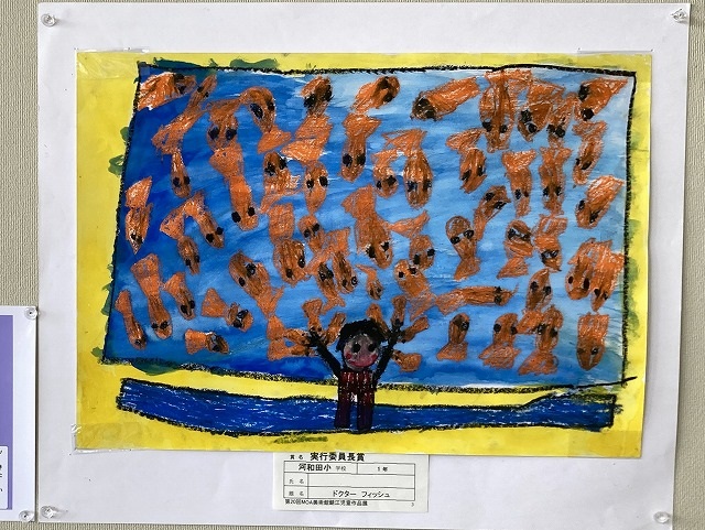 (受賞の言葉):「すいぞくかんで、ドクター フィッシュを見たり、さわったりして、たのしかったので、このえをかきました。ドクター フィッシュをたくさんかけたので、よかったです。こんどは、ほかのおさかなもかいてみたいです。」