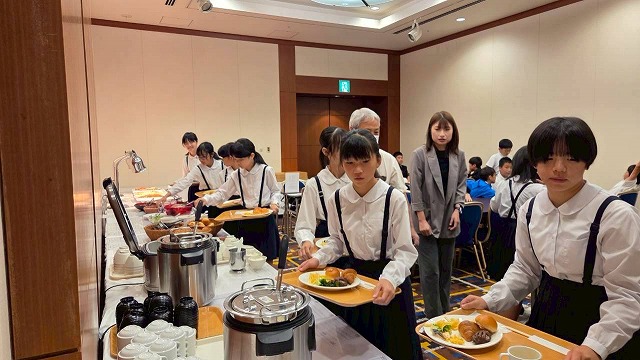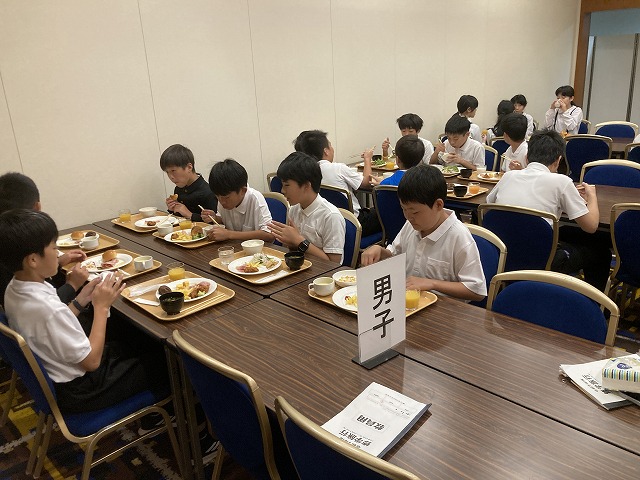 USJで思い切り楽しむことができたようで、昨夜は10時消灯で、みんなぐっすり眠ることができたようです。6時に起床し、制服に着替え、朝食会場に集合しました。