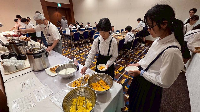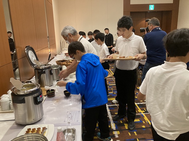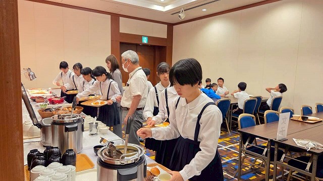 朝食は、バイキング形式です。事前に、栄養教諭から栄養バランスの良いメニューの選び方を伝えてあります。