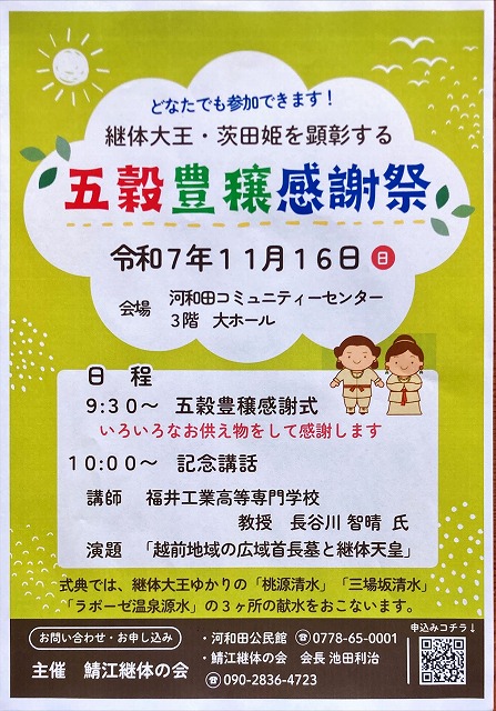 11月16日(日)には「五穀豊穣感謝祭」が河和田コミュニティーセンターで行われます。例年、「かわだっ子」が、古代衣装をまとって儀式に参加します。今年も募集されるそうですので、ぜひ、ご協力ください。