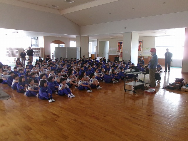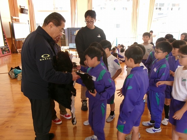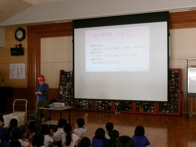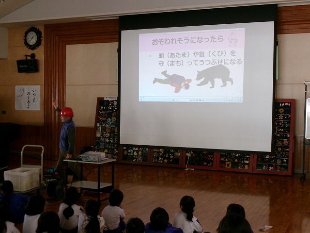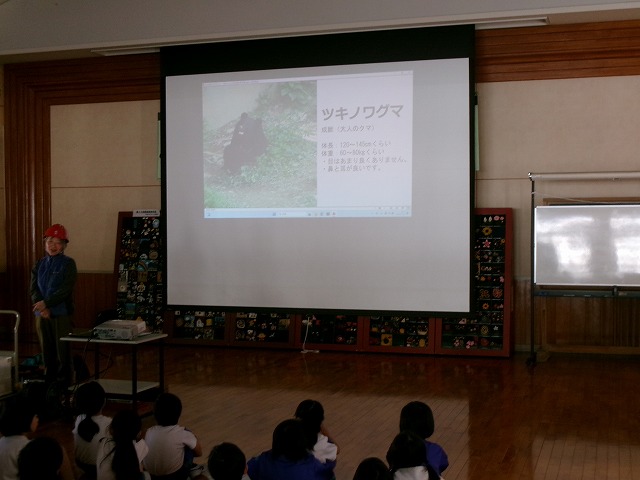 校区内のクマの目撃・痕跡情報が相次いでいる状況を鑑み、「鯖江市鳥獣害のない里づくり推進センター」から講師の方をお招きして、児童を対象にお話をしていただきました。