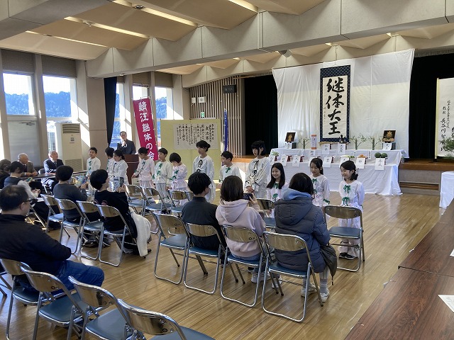 「献水の儀」の場面では、神様の代理役の方に、地域の清水や温泉源水の入った竹筒を手渡しするという大役をしっかりと務めました。
