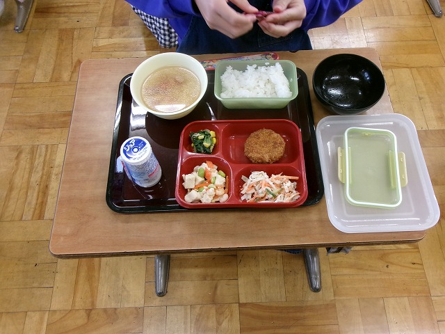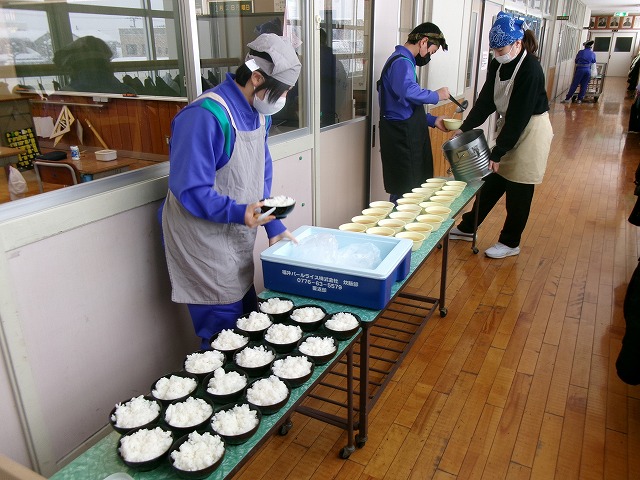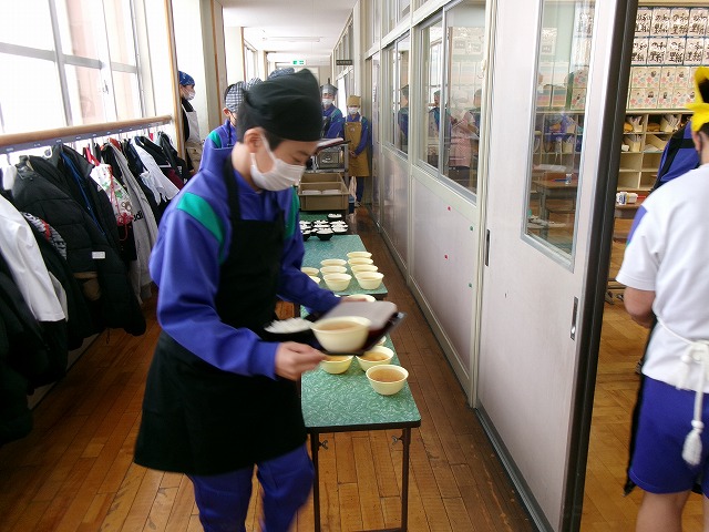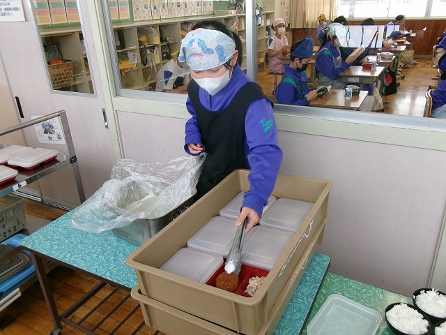 副食とお汁は、いつもの小学校のお椀とは違って、中学校で使う容器に配膳しました。