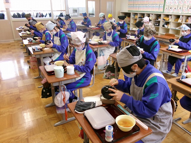 6年生が、一足早く、中学校の給食を体験しました。