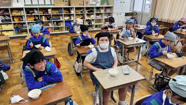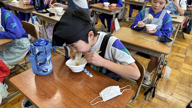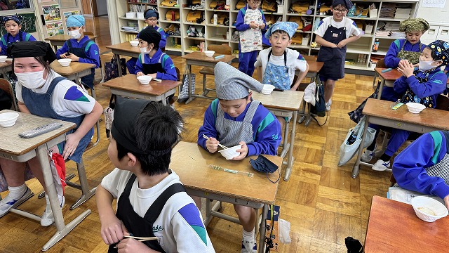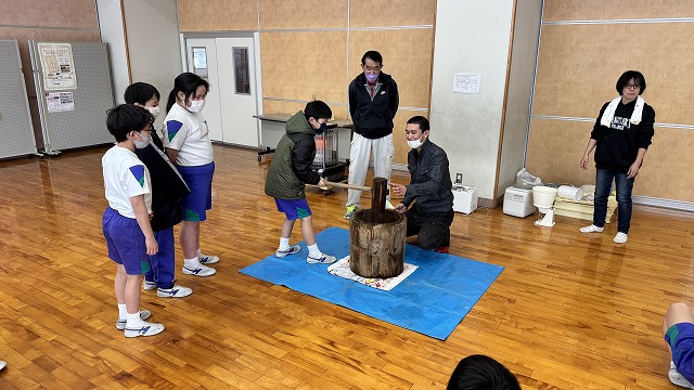 4年生が「田植え」を行い、「稲刈り」して収穫した「もち米」を用いて、いよいよ最終段階の「もちつき」を体験しました。