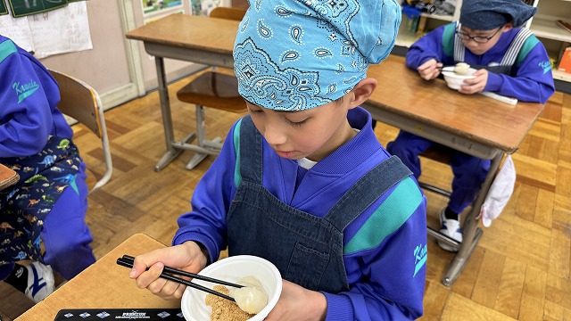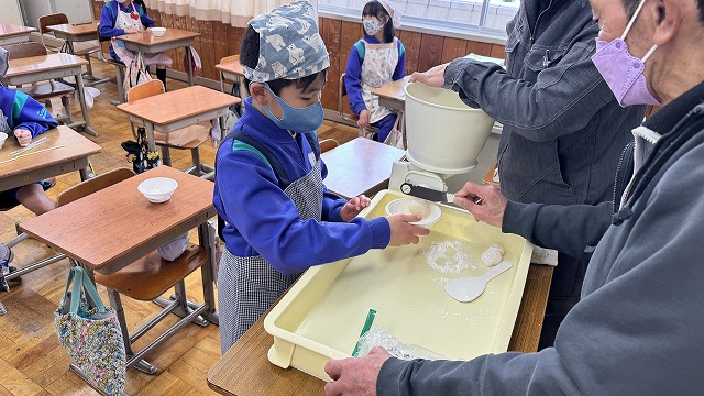 教室に戻り、つきたての「お餅」を丸めてもらいます。