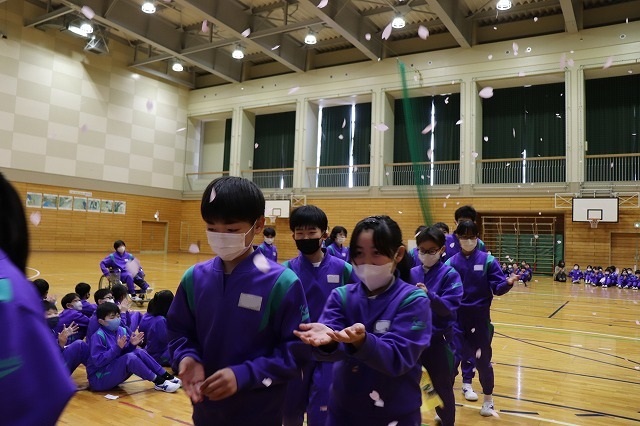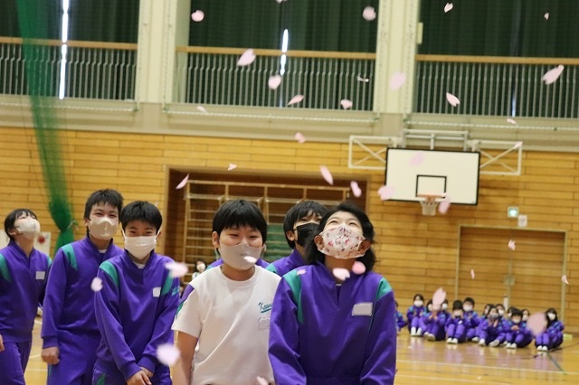 最後に「桜吹雪」の中を6年生が退場し、第1部が終了しました。