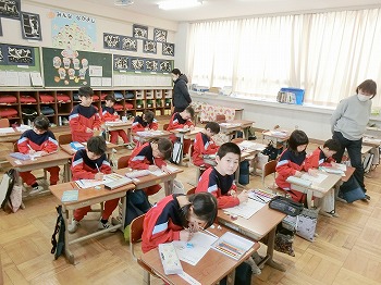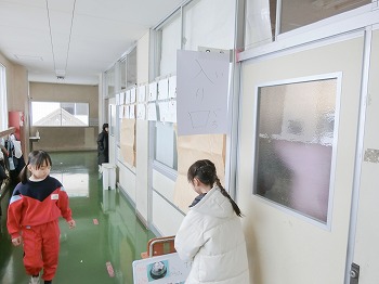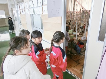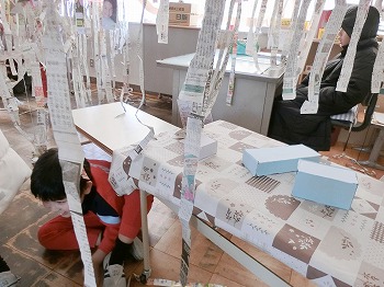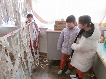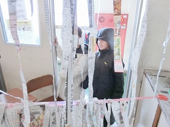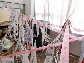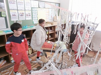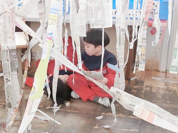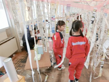 2年生が、生活「つないでつるして」で教室中を新聞紙等でつくった紙迷路に仕立て上げていました。そして作った新聞迷路に1年生を招待して、宝さがしを楽しんでもらっていました。つないでつるした新聞紙で2年教室が圧巻の風景でした!よくがんばりましたね!