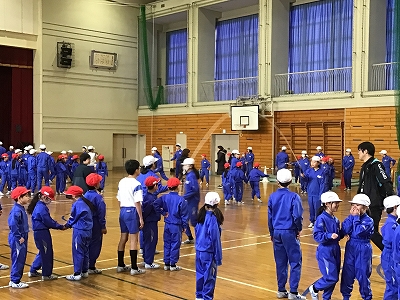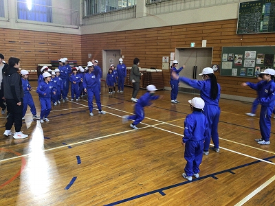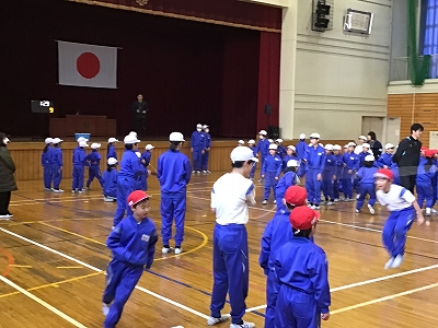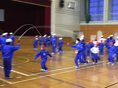 低学年の大なわとび大会に向けて6年生が8の字回旋跳びの見本を見せたりタイミングを教えてあげたりしてくれました。6年生が跳ぶ様子を見た低学年の子は憧れの目で感心しきりでした。もうすぐ卒業する6年生との交流はよい思い出となりました。