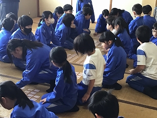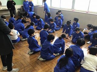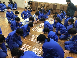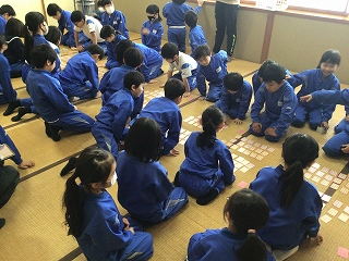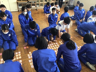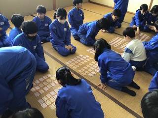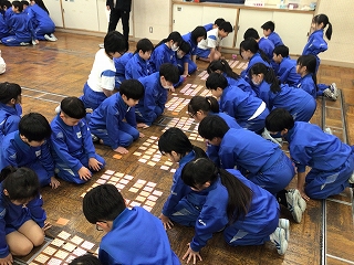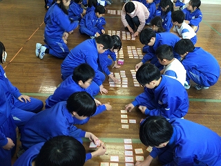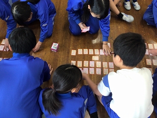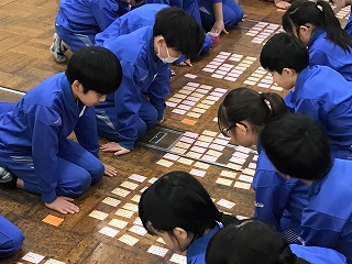 縦割りグループごとに百人一首大会を行いました。本校では、児童玄関に「今日の一首」が日替わり表示されていたり毎日放送で詠んだりと、伝統的に百人一首がとても盛んです。読み手の声に集中し真剣に札をさがしていました。