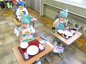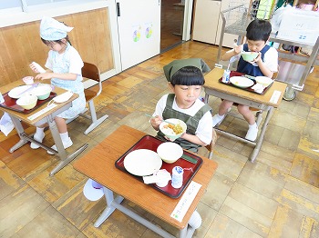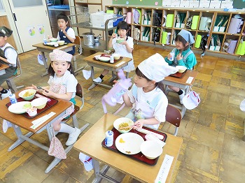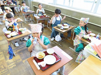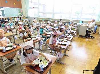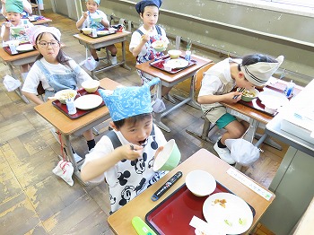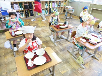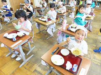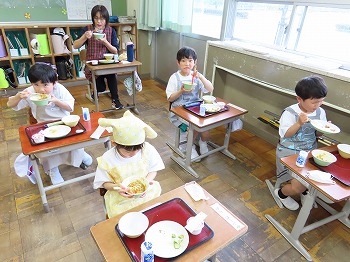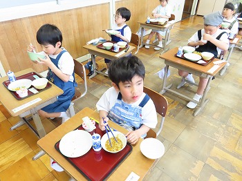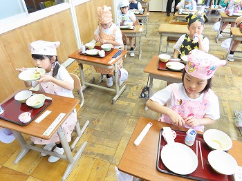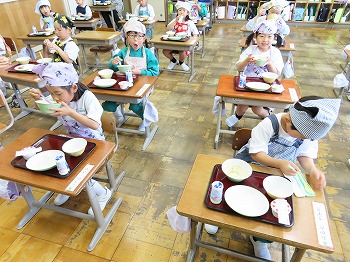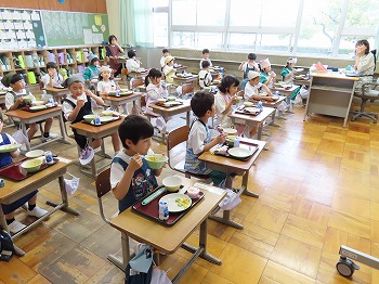 1年生は、今日が小学校初めての給食でした。今日はチキンカレーで、お祝いデザートのゼリーもありました。昨年度までの園のころと比べたら量が多くなっているかと思いますが、ほとんど残さず食べきれたようです。すばらしいですね!ご家庭でも、ぜひ話題にしてみてください!