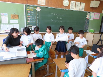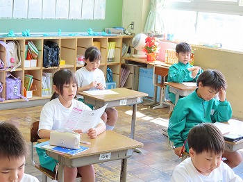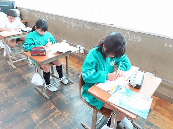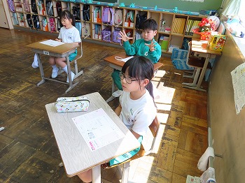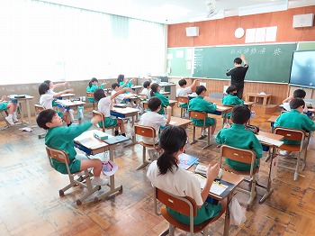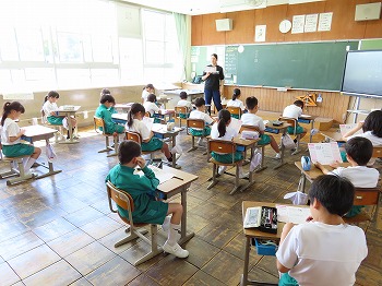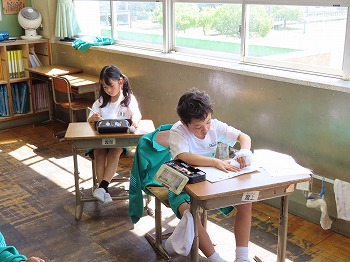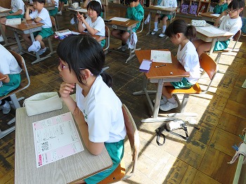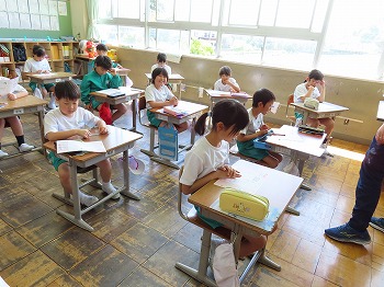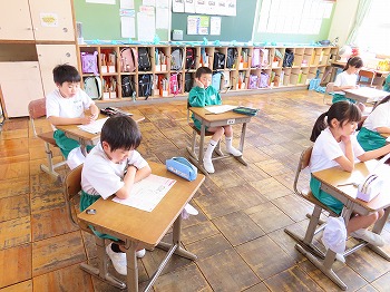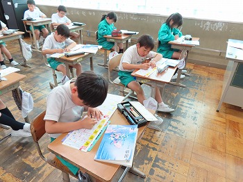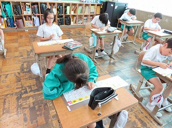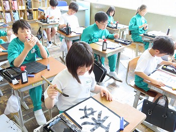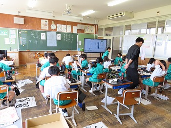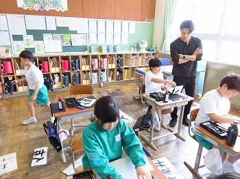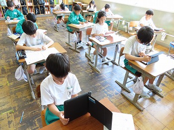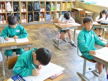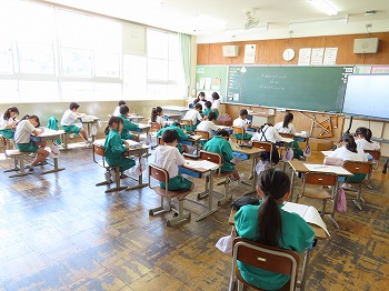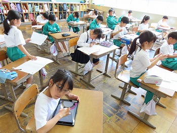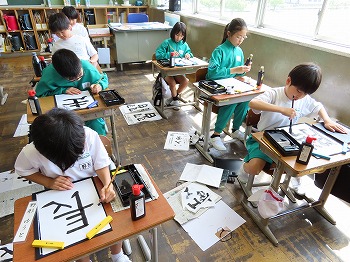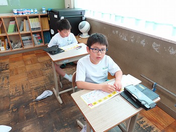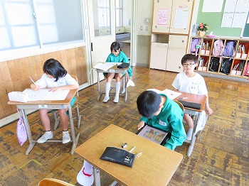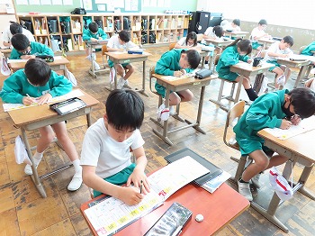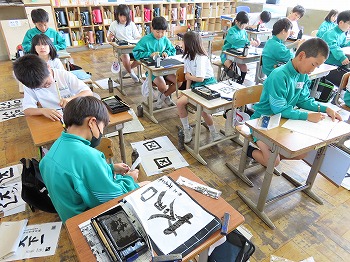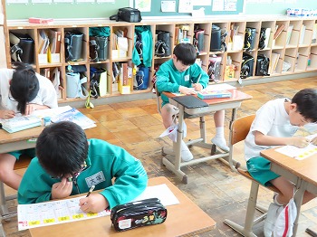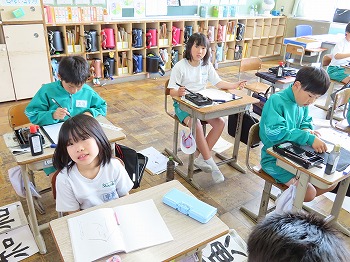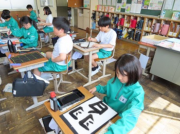 今日の授業風景です。4年1組は、書写で好きな文字を大きく書いていました。3年2組は、算数で九九の復習をしていました。3年1組は、テストをしていて、早く終わった子はタブレット学習をしていました。4年2組は、国語で漢字の書き順やドリルをしていました。