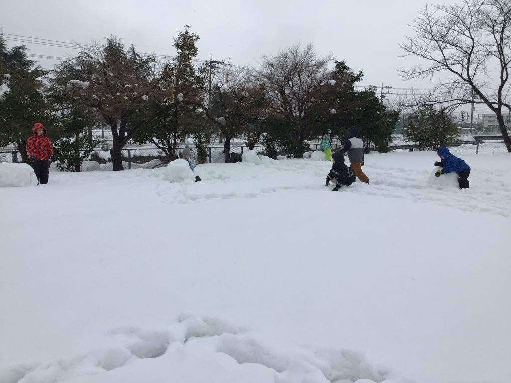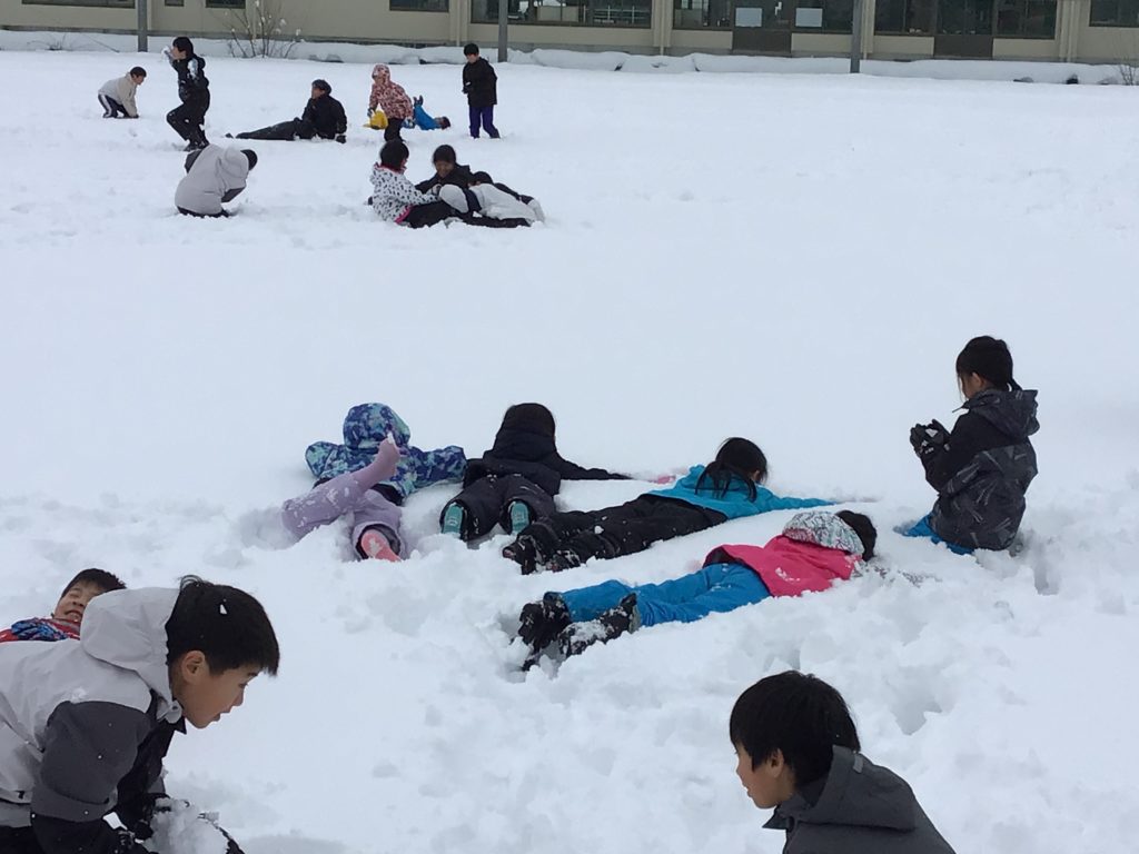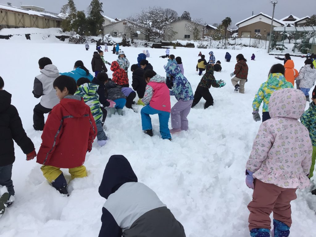 たくさん雪が積もりましたね。こんな雪の日でも、子どもたちは、元気いっぱいです。生活の時間に、みんなで雪遊びをしました。雪合戦をしたり、大きな雪だるまを作ったり、雪の上に寝転がったりと、思い思いに楽しんでいました。同時に、雪遊びのルールなども確認し、安全に遊ぶことができるよう話もしました。寒さに負けず、安全に楽しんでほしいですね。