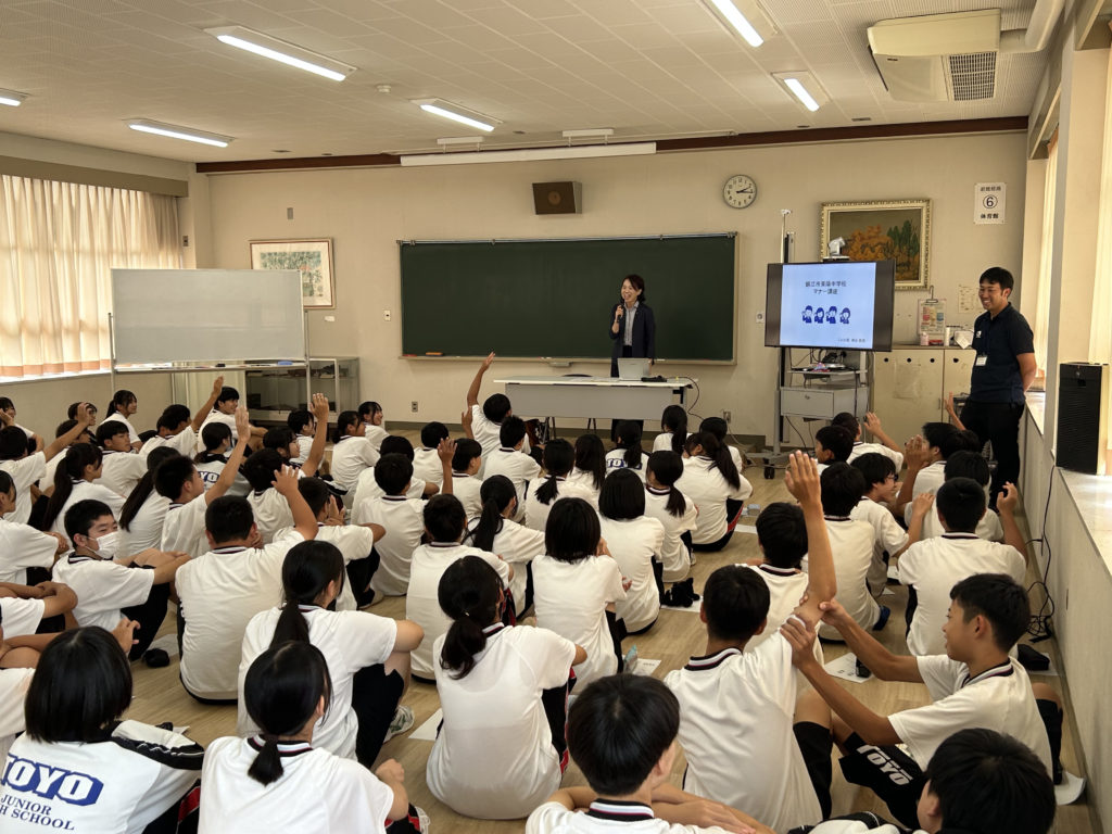 10/21,22に行う職場体験学習に向け、2年生がマナー講座を受講しました。マナーコンサルティング「ことは理」 枡谷真澄様にご来校いただき、マナーとは何か、コミュニケーションをとる上で大切なポイントなどについてお話いただきました。