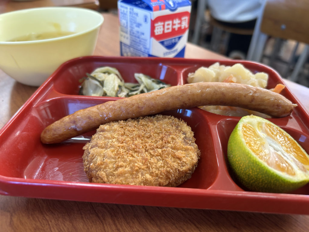 他に、メニューは打ち豆の味噌汁、ロングウィンナー、じゃが芋の田舎煮、小松菜の塩昆布和え、みかん、牛乳と、ボリュームのある副食でとてもおいしかったです。この後も、月に1回くらい「プラスワン」給食が予定されています。楽しみです!