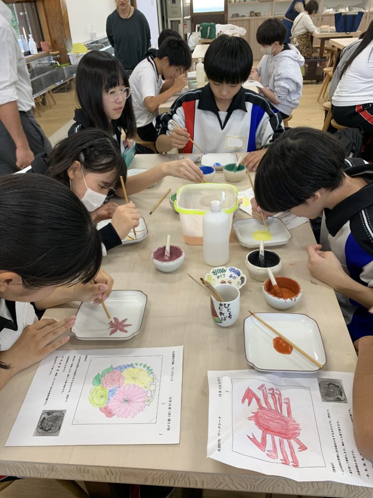 その後、久谷陶芸村にて絵付け体験をしました。