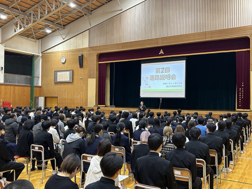 まず、進路説明会では、校長挨拶に続き、進路担当者から最近の入試の特色・近年の変更点や今年度の入試日程について説明を行いました。Web出願になったことをはじめ、近年入試のやり方が大きく変化してきています。ご家庭でよく進路についてお話していただき、3年生の生徒の皆さんは夢に向かってしっかり学習に励んでください!