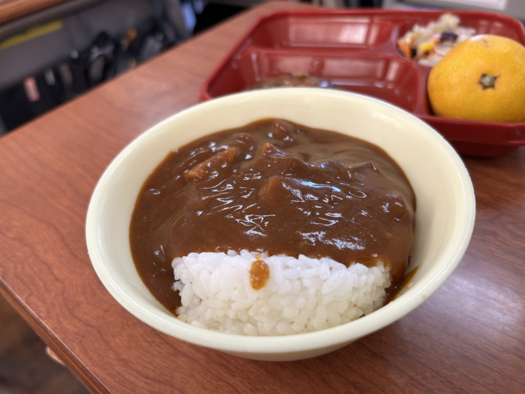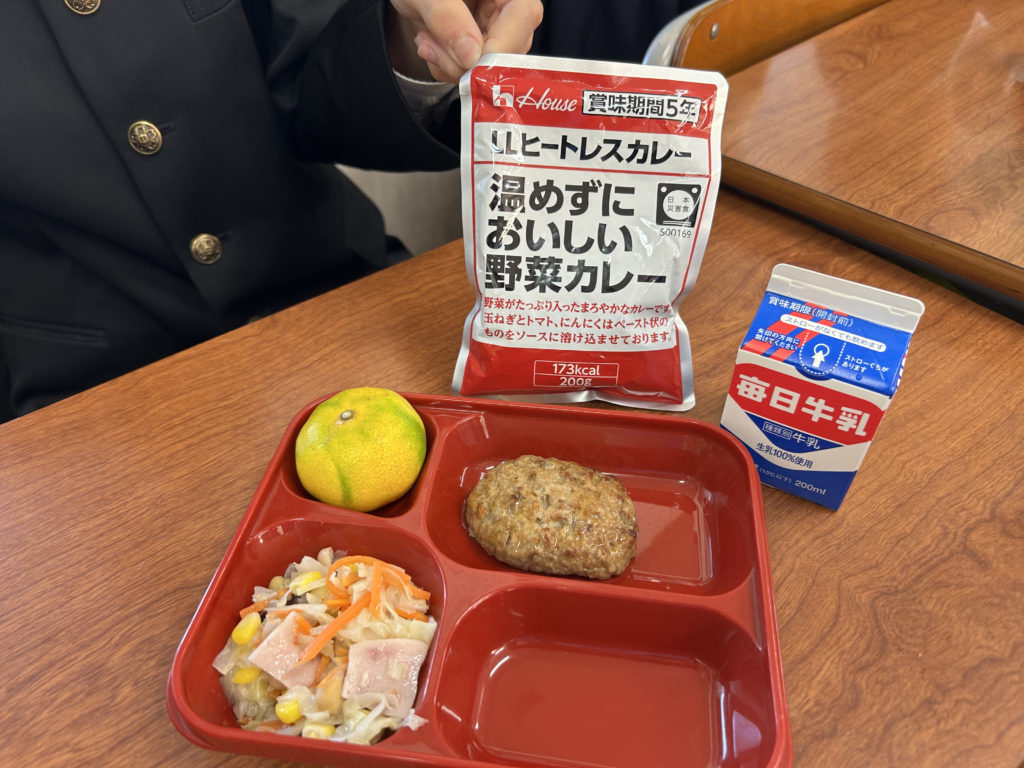 実は、市の防災教育の一環として行われた防災食のカレーです。非常災害時、通常の給食が実施できない場合や、すぐには保護者の方への引き渡しができず学校に生徒の皆さんを留め置く場合が考えられます。万一に備えて学校に配備されている保存食を食べてみるという体験活動でした。冷たいまま食べることができるので、災害時を想定して実際に袋からそのままお椀に移して冷たいまま食べてもらいました。
