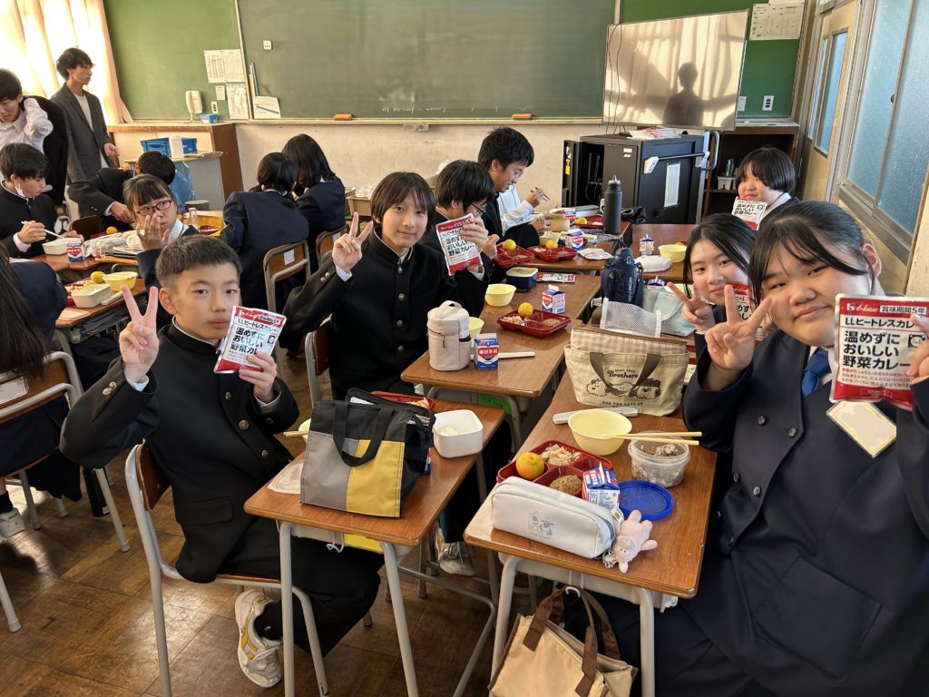 長期保存が効く食事というと、古いイメージではあまり味気ないものを想像してしまいます。しかし、落ち込みがちな災害時に、せめて食事で前向きな気持ちをもってもらいたい、と開発されてきたこのカレーはとてもおいしく感じられました。食後の生徒の振り返りには、「おもってたより全然美味しかった」「思っていたよりもちゃんとカレーみたいな辛さとか味があって美味しかったです。あと、栄養も見てたけどちゃんと取れるものが入っていて安心しました。」「今日は防災食を食べました。少し冷たかったけど味は普通のカレーと変わらなかった。とても美味しかったです。いざという時に備えてこうした非常食を試しておくことは安心につながると感じました。これからも非常食の味や保存方法を知って防災への意識を高めたいです。」などの感想が多く見られました。