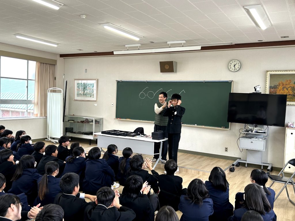 講師は有限会社オプト.デュオ代表取締役 山岸誉様です。めがね産業が鯖江市で盛んになってきた歴史や鯖江のめがねづくりが分業制が主であるといった産業の特徴に触れ、さらにご持参いただいたユニークなめがねを見せながら、デザインとはどのような仕事なのかをご紹介いただきました。代表で出てくれた生徒がめがねをかけると、いつもと雰囲気ががらりと変わり、驚きの歓声があがっていました。