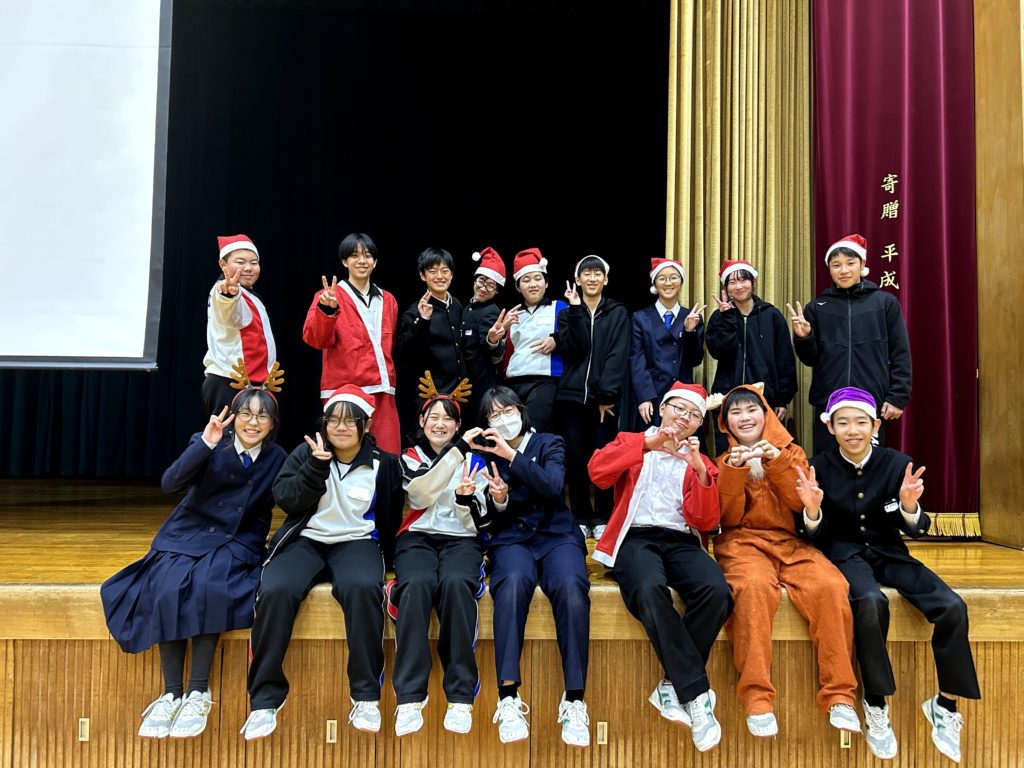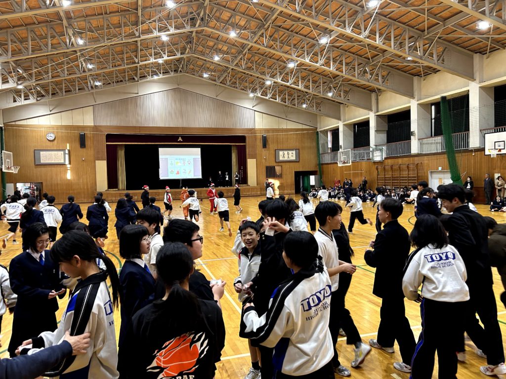 東陽タイムに、生徒会が主催するクリスマス集会が開かれました。異学年で交流することを通して、全校生徒が互いに温かい人間関係を築くことを目的に行いました。全校が4チームに分かれて、ゲームを楽しみました。
