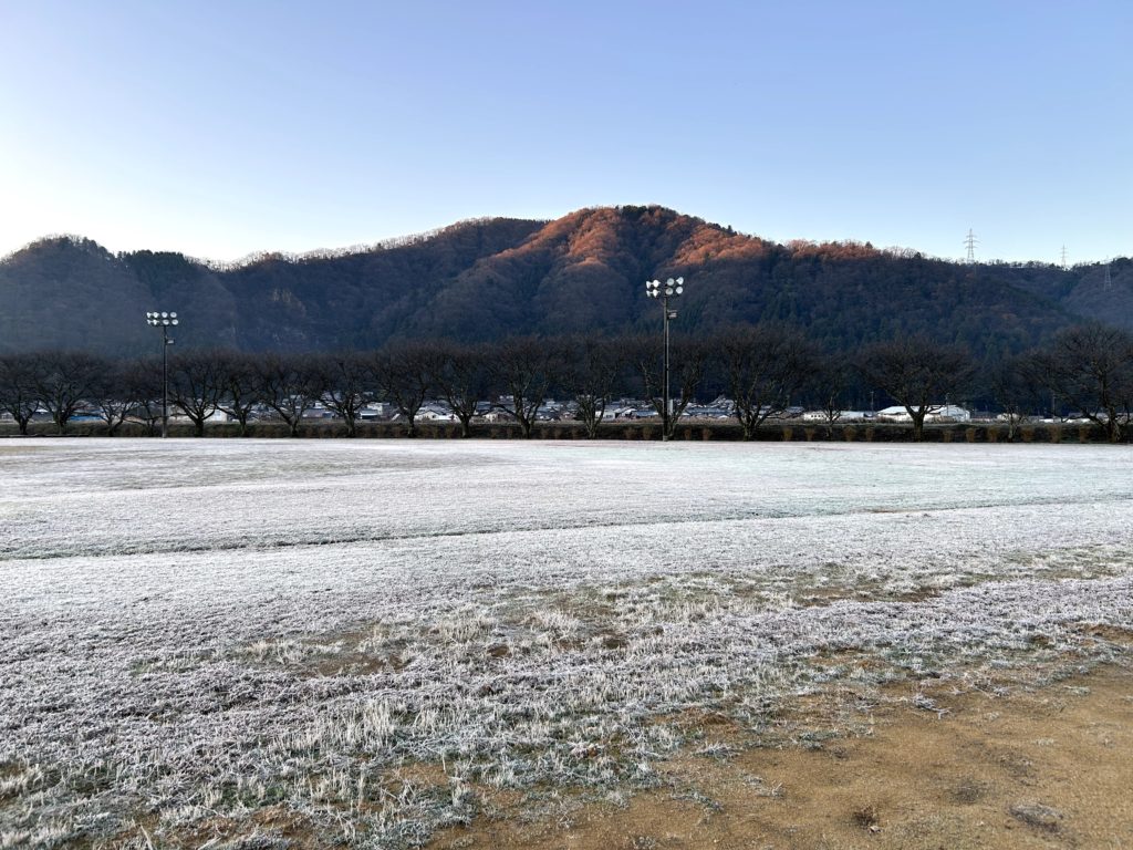 今朝は気温1度、冷え込みました。車のフロントガラスは凍り、学校に着いてみると霜が降りて真っ白でした。