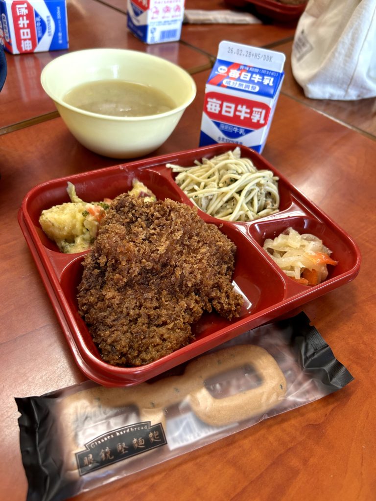 地場産食材を使用した副食を追加し、食育を推進する給食の日、プラスワン給食の日でした。鯖江市のお菓子「眼鏡堅パン」がつきました。福井県立大学が開発した「ふくこむぎ」が使用されているそうです。とっても堅いですが、ごまの風味がよくきいていておいしく、ゆっくりよくかんで味わって食べました。
