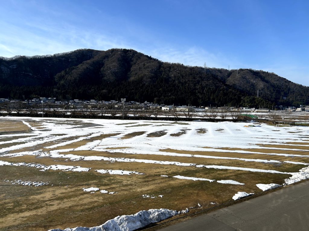 最高気温11℃、雪がどんどんやせています。グランドの雪もよく溶け、不思議な幾何学模様が現れていました。