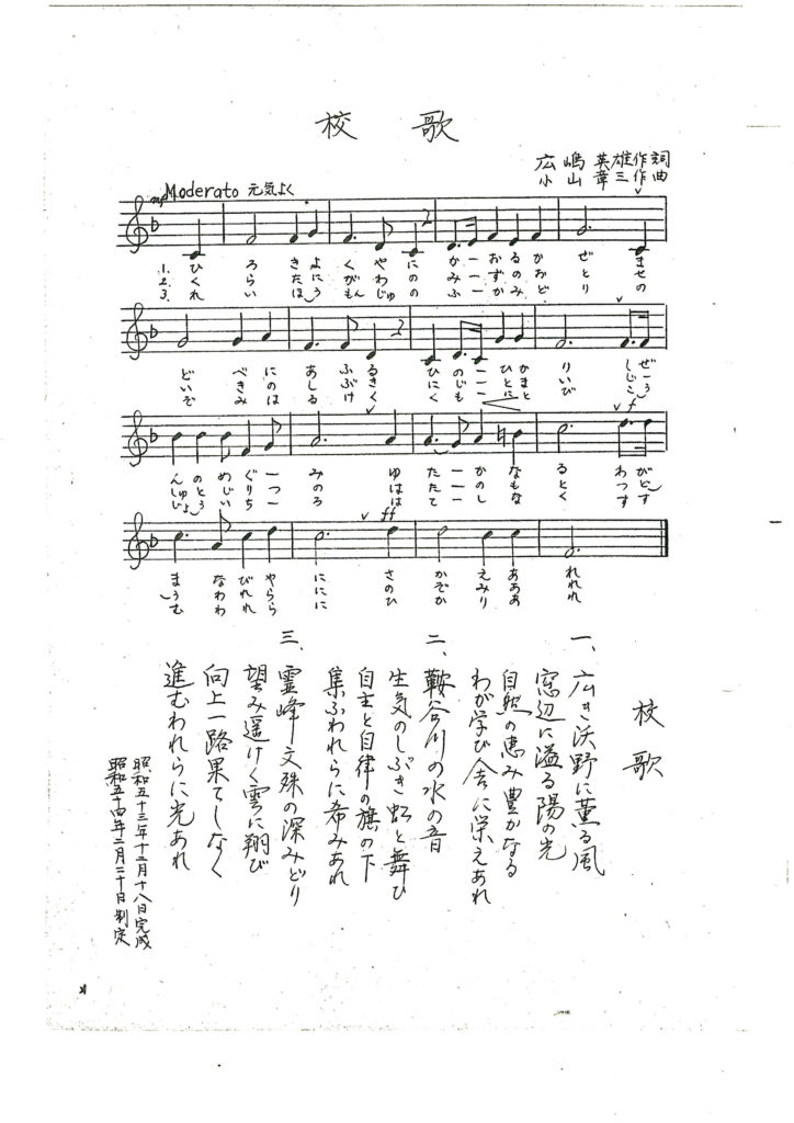東陽中学校の校歌は、作詞:広嶋英雄氏(東陽中学校初代校長)、作曲:小山章三氏(国立音楽大学教授(当時))です。沿革誌には、校歌成立の流れとともに、作詞・作曲への思いが記載されています。