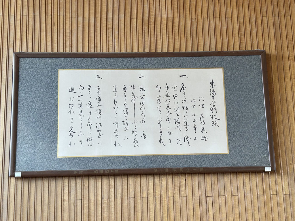 体育館にかかっている校歌は、沢田白寿氏(洗心書道学院(当時))による揮毫です。